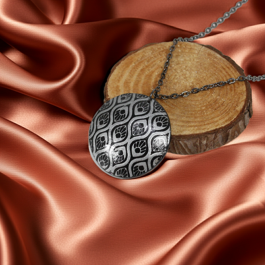This stylish black and silver pendant necklace is handmade from polymer clay and features an organic silver pattern. With its sophisticated design, it's sure to add a touch of elegance to any outfit.